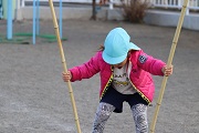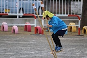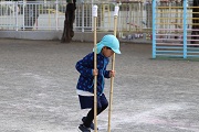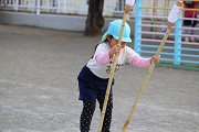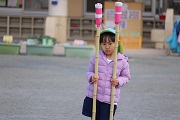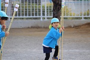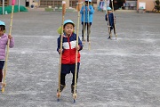 11月末に作成した竹馬を今は、園にもってきています。毎朝、園庭に出て練習しています。10日たらずの練習で、もうしっかり竹馬に乗り、上手に歩き回っている園児もいます。まだ苦戦し、うまく乗れず、2、3歩の園児もいます。でもどっちでも毎朝、一生懸命に練習に取り組んでいます。2学期中には全員がうまく乗れるようになることでしょう。がんばろう!