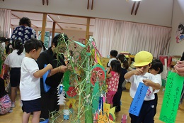 7月5日(火)は昨日の暑さがうそのように涼しい日です。みらい保育園おかべの保護者の方が準備してくださった竹2本に、七夕飾りをご家族といっしょに飾りつけました。いままで作ってきた夏らしい作品や短冊に書いた夢や願い事、はさみとのりを使って器用につくった飾りを竹いっぱいに飾りました。7日(木)が、保育園と幼稚園、合同の「七夕集会」です。みんなの願いが届くよう、いっぱい星が見られる天気だといいなと思います。