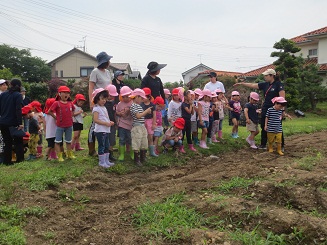 帰りには、お母さんにどんな料理をつくってもらおうかな。何が好きな料理と、おかあさん先生との会話がはずんでいました。自分たちで収穫したものには夢が広がります。今日は蒸し暑く、安全・体調には十分に注意し行ってきました。