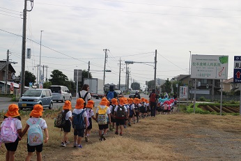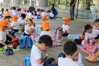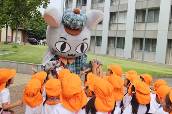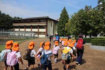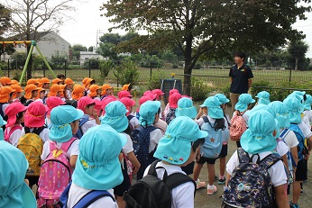 9月13日(木)は、園外保育で埼玉工業大学へ出かけてきました。春の遠足以来のお出かけです。お天気は晴れ、きれいな秋の空が広がりました。3歳児は5歳児のお兄さんやお姉さんと手をつないで、そして4歳児がそのあとを歩いて、歩きました。信号のある道路や横断歩道をわたって、ネギやブロッコリーの畑を見て、埼工大を目指します。ふかにゃんと大学の方に迎えら集合写真をとっていただいたり、水槽に泳いでいるお魚(「岡部の小川でとった魚」と書かれていたものもありました)を見せていただきました。