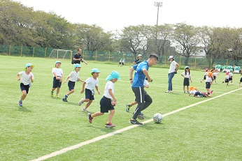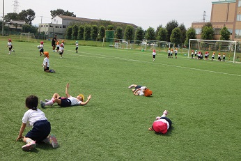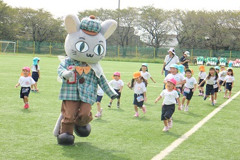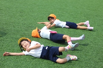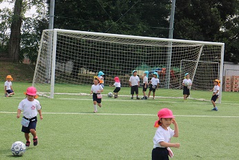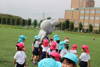 一休みした後は、広いサッカー場で走りました。サッカー部の先生にボールを借りてサッカーをしたり、ふかにゃんとかけっこしたり(園児の話ではふかにゃんはすごく速かったそうです。)、園児たちはふわふわの芝の上でゴロゴロとやわらかな感触を楽しんでいました。