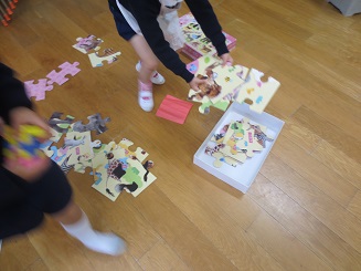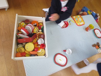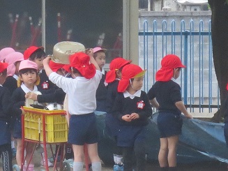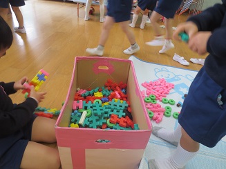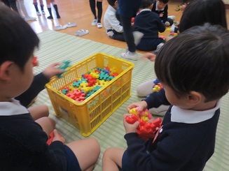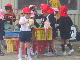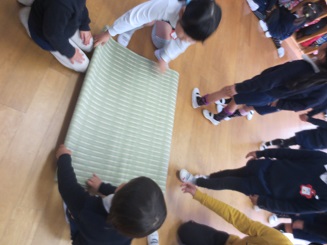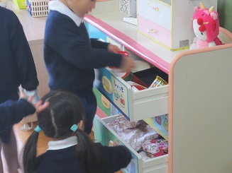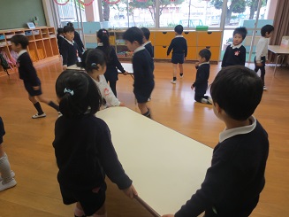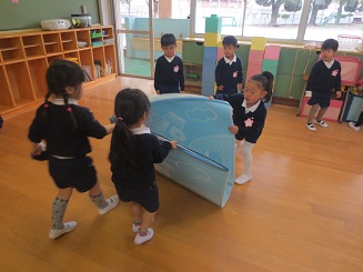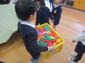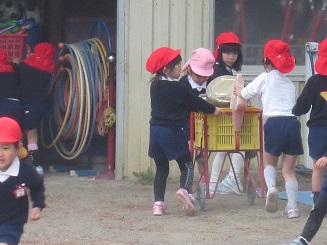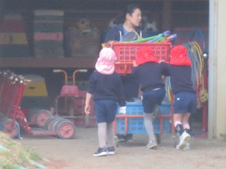 園児は、もっと遊びたい気持ちにストップをかけ、気持ちを切り替える。次に時間に使いやすくするために、重いものは協力して力を合わせ、友達の分も親切に、どこにどのように片づけるかの約束が決められている。短時間にほぼ片付け終了。すさきりと・・・。 場を整えることは生活する上での理にかなった基本、その場その場に神様がいるんだね。