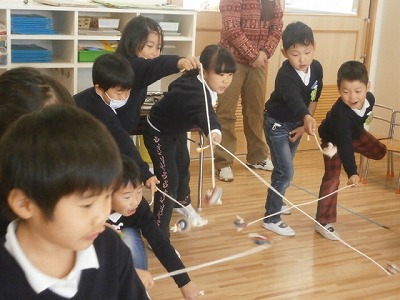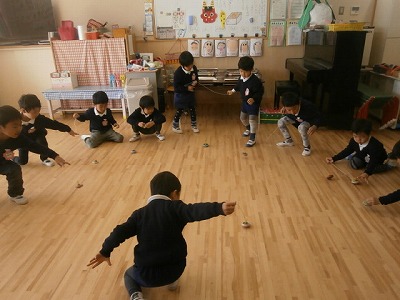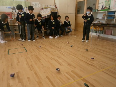 さくら組、コマ大会の様子です。みんな回せるようになりました。