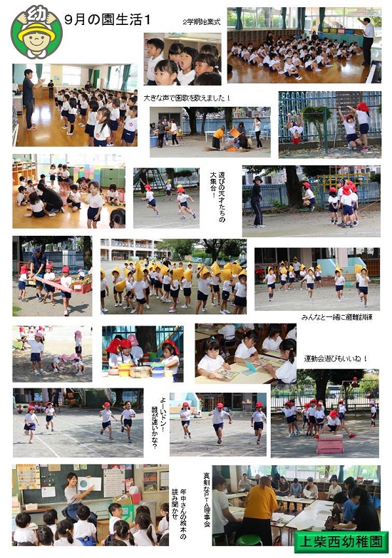 子どもたちは冬休みに入りました。この冬休みを利用して、二学期の活動を写真にまとめて紹介しています。今日はその1回目です。(二学期の始業式・避難訓練・絵本の読み聞かせ等)