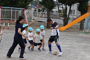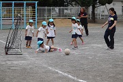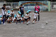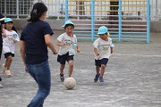 先月に第1回のサッカー教室を予定していましたが、当時、とても暑くて、熱中症の心配があったため中止しました。今日が今年の最初のサッカー教室になり、子どもたちも元気にボールを追いかけていました。でも、協力してくれたお母さんたちの方がうまかったね。