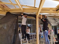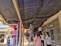 これからの季節、気温が、高くなるのでPTAで、テラスの上に遮光ネットを張りました。