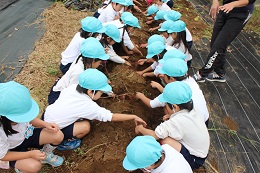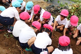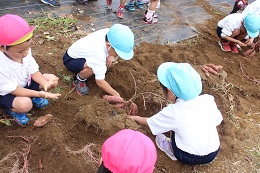 10月28日(金)は、午後からの雨予報です。日に日に寒くなるので、今日、幼稚園の畑の芋ほりを行いました。一列に並んで、いっせいにもぐらさんのように土を掘り始めました。「あったよー」「見てみて」の声が飛び交う中、土の中からサツマイモが顔をのぞかせました。つるはクリスマスリースにしようとまあるい輪にしました。サツマイモが育っていてよかった、と安堵しました。子育てひろばでもお世話になっている先生から、苗をいただきました。苗を届けていただき畝まで立ててくださいました。ありがとうございました。おかげさまで、秋の体験ができました。