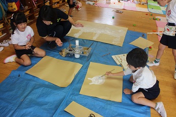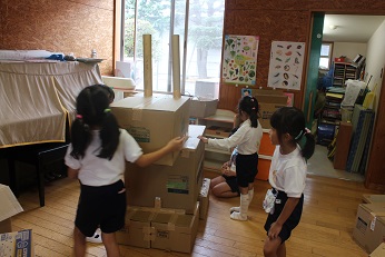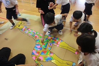 10月8日(火)は、どのクラスでも「動物園の思い出」が保育に取り入れられ、おかべ幼稚園動物園ができつつあります。5歳児は、大型動物づくりを空き箱で始めました。来週の「子育てひろば」を目標に、みんな急ピッチで進めています。4歳児は、紙を何枚もつなぎながら、好きな動物を思い切り描いています。3歳児は、おしゃれなきりんの出来上がり。みんな一人一人、めいめいのちぎった紙をもって貼り合わせていました。出来上がりが楽しみです。