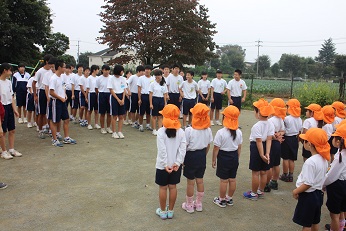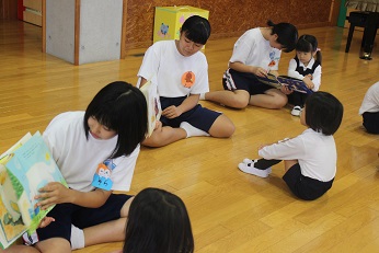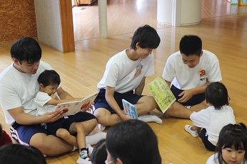 今日11日(木)は、岡部中学校の3年生の幼稚園訪問の2回目でした。今日は4歳児、しか組さんです。曇り空でしたが、外遊びを楽しみました。中学生のお兄さんやお姉さんに手をつないでもらって、本当にうれしそうでした。外遊びのあとは、読み聞かせです。予め準備し、練習をした絵本を読んでいただきました。あったかい膝の中ですっかりとリラックスしていました。