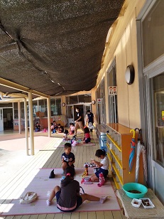 暑かったのでテラスにの日かげにゴザを敷いて食べました。