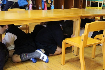 4月18日(水)は平成30年度初めての避難訓練でした。新入園の園児たちにとっては初めての「自分で自分の身を守る」訓練です。3歳児は「怖いよぉ」という声も聞かれましたが、非常放送が流れたら身を守る態勢がとれるができるようになるまで成長してほしいと思います。4・5歳児はさすがに落ち着いて避難できていたようです。このようなあらゆる災害を想定した避難訓練は月に一度行います。