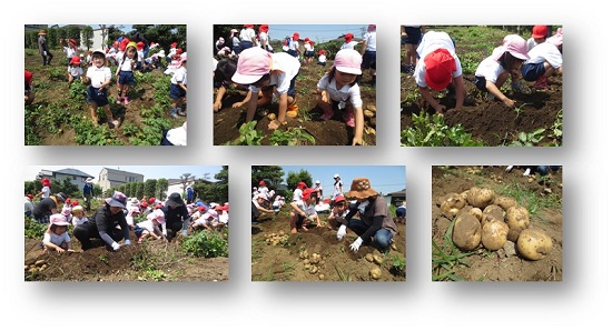 23日(金)に歯科園医の金井先生の畑に招待され、ジャガイモの収穫体験をしてきました。天候が心配されましたが、多くの保護者の方に参加協力をいただき、安全で楽しいジャガイモ掘りになりました。茎を引く抜いてジャガイモが出てくると「わ~、いっぱいある!」と歓声が聞こえました。