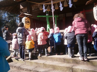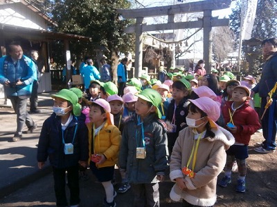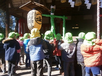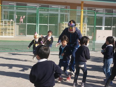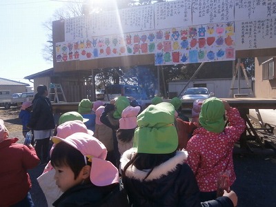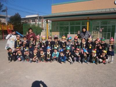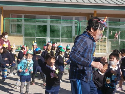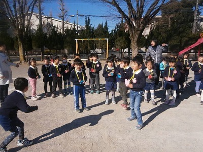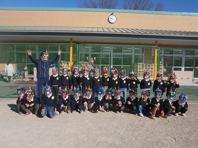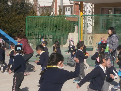 昨日に引き続き、風の強い日でしたが、園庭には、「おにはそとー。」と、元気な声が響いていました。2クラスで鬼役と投げ役を交代して、豆まきをしました。