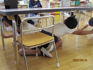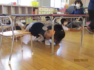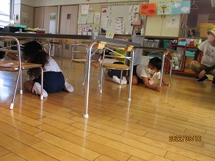 机の下にもぐり、頭を守り机の脚をしっかりと持って