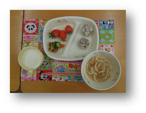 ※写真は外遊びで鉄棒をしているところと竹馬カード作りと今日の給食です
