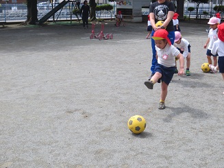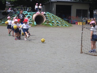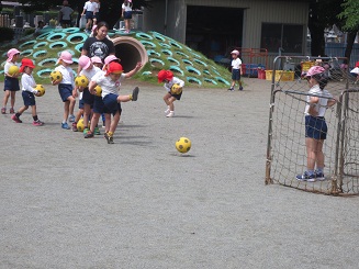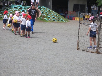 朝の戸外遊び、年長さんがシュート遊びをしていました。