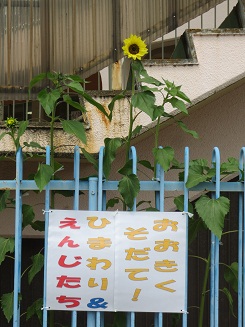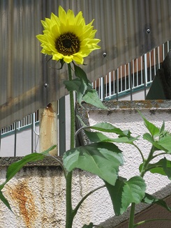 令和初のひまわりが元気に咲きました。昨年育ったひまわりの種が冬から芽を出していたので育ててきて、今大きくなり開花しました。良いことありそうな幸せをよぶ黄色の花が、輝く太陽に向かい咲いている。