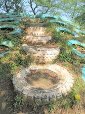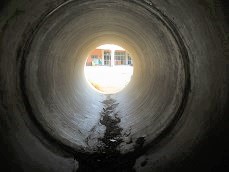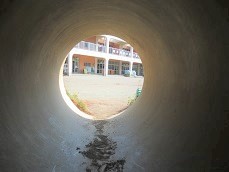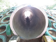 ○築山の土管の中は・・・・。入ってみると、暗くて涼しいよ 声が反響しますよ。怖くないよ。中から外を見るとこんな感じきりん組さんたちはまだ、入ったことないかな