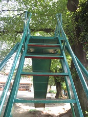 きりん組さんへまだ、幼稚園に一度も登園してないから、園の遊具で遊んだつもりで紹介します。目線で○滑り台はこんなです。結構写真にとると急な感じです。
