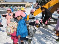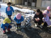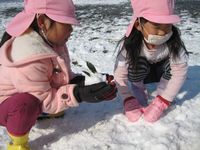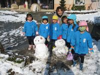 幼稚園に登園するなり雪遊びに夢中!雪だるま、雪うさぎと様々なものができました。