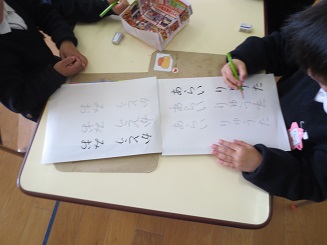 年長さんが手紙ごっこ遊びで年中さんに贈るため、年中さんも返事の名前ぐらいは書こうと、プリントになぞって練習しました。文字の勉強ではなく、自分の字に気づいてみる程度ですが、頑張っています。