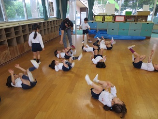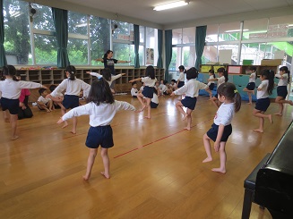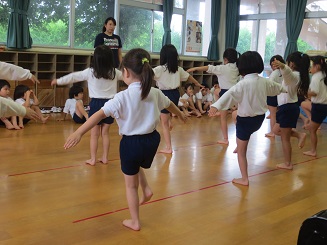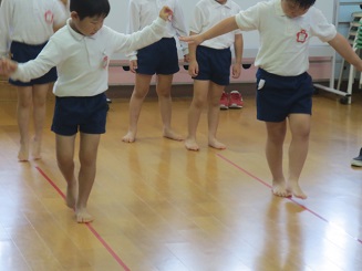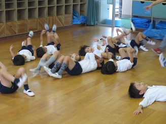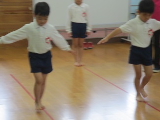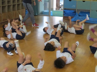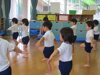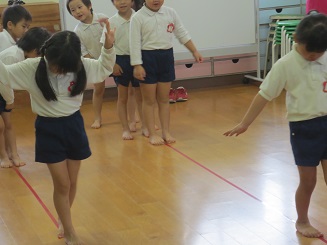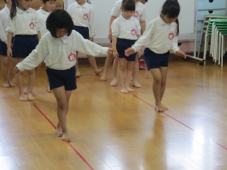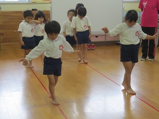 意外とバランスの良い子がいました。バランス感覚は小さいときが勝負。ご家庭でもやってみてください。雨でも楽しく運動もしました。