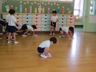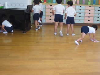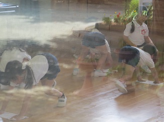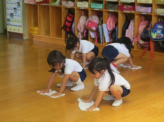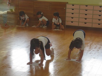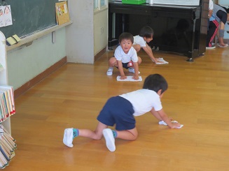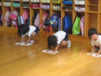 今日は、少し大掃除として園児は床をぞうきんで磨きました。
