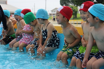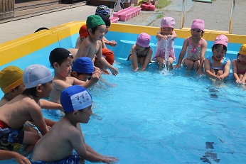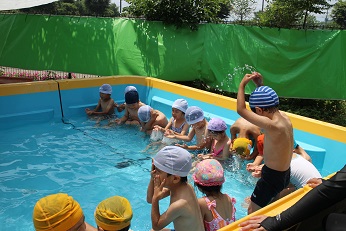 6月26日(水)は、朝からきれいな青空が見えました。雨の中プール設置をしていただき、プール開きをしたものの雨が降ったり、朝が涼しかったりとなかなかプール遊びができませんでした。3歳児は何回も水着をきる練習をしたりと準備してきて、やっと今日その成果を発揮、プール遊びを楽しみました。園児たちの歓声が上がり、夏らしい光景を楽しみました。明日も入れるかな?