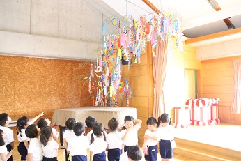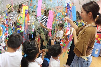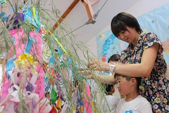 7月3日(火)は明日の七夕まつりのための飾り付けを行いました。お家の方に手伝ってもらいながら、楽しく飾り付けを行いました。自分の願い事やご家族のわが子にこめた願い事が書かれた短冊や先生たちといっしょに製作した七夕飾りが飾られました。明日は、みらい幼児園おかべといっしょにみんなで「七夕まつり」を行います。夏らしい行事の幕開けです。