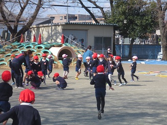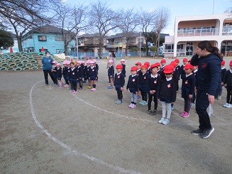 今日は園庭で遊んでいるとき、地震が来た時の避難でした。素早く中心にあつまる避難、その真剣さにいつも感心しています。
