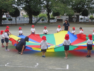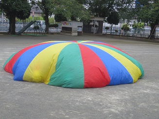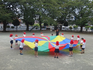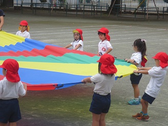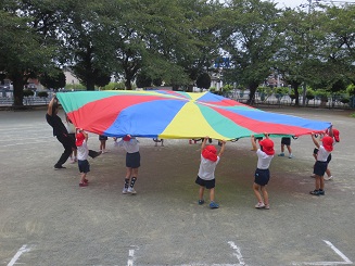 きりん組は、バルーンを取り入れます。人数が少ないので可能かどうか、ためしの練習をしました。みんなで一致団結しないと失敗します。何とかできそうです。がんばれ・・・。