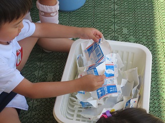 牛乳パックは飲んだら自分で洗い、パックを開いてかごに入れ干し、資源にします。
