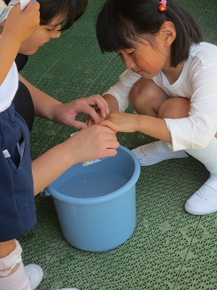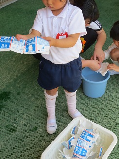 きりん組さんは手の力も小さくパックがなかなか開きません。先生は水の洗い方、開ける場所(力を入れる場所とコツ)はあっているかなと毎回一人ずつ一緒にやりながら、力を添えてくれます。毎回毎回少しずつ少しずつ。まだ、全部出来る子はいませんが、3学期には必ずできるようになっていきます。がんばれ頑張!小さな体験を励まし見守る先生たちがいます。