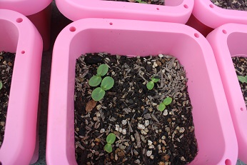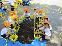 園児たちは毎日、いとおしそうに水やりをしています。「芽がでたよ」「4つもでたよ」、毎日生長する野菜や花の苗に大喜びです。大切に育てる体験、自分の鉢に責任をもって水やりをする責任感、大事な心が育ちます。