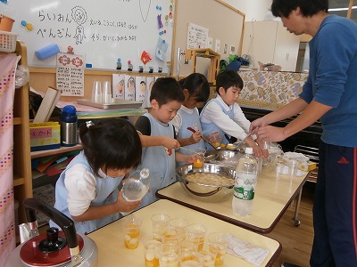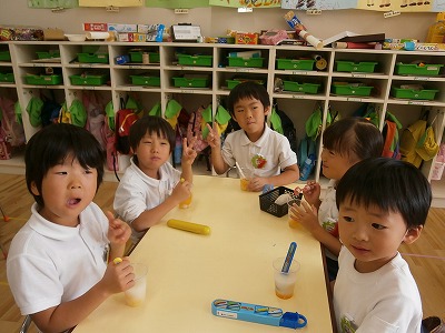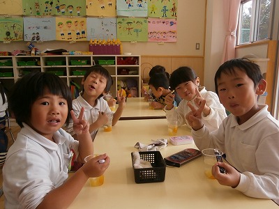十五夜、十三夜は終わってしまいましたが、幼稚園では今日お月見会をしました。年長さんが、白玉団子を丸めてくれました。ゆであがった団子と、フルーツと、サイダーを合わせ、フルーツポンチにして食べました。年中さんにもおすそ分けをし、みんなでおいしく食べました。2回おかわりできた子もいて、満足そうな顔をしていましたよ。