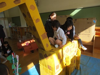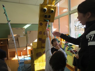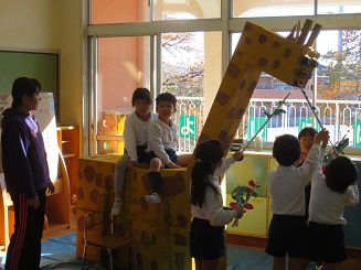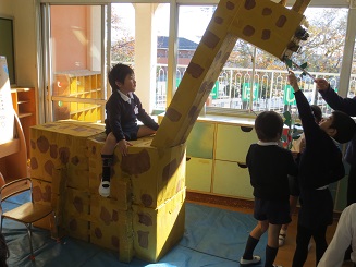 首を長-くして、頑丈に作ったきりん乗ったり、餌をやったりと楽しそうです。
