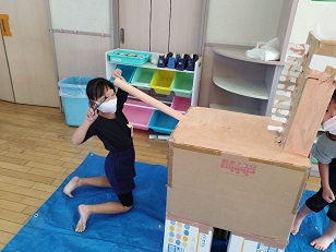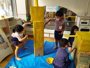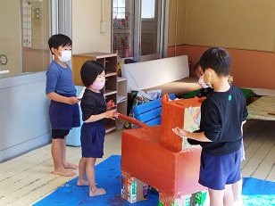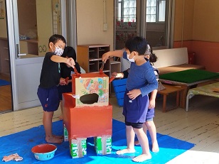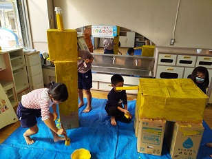 手、足、服、床あちこち汚しながら夢中になって色塗りをしました。