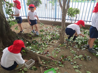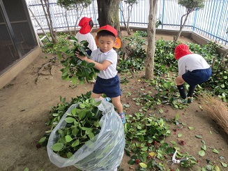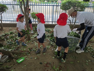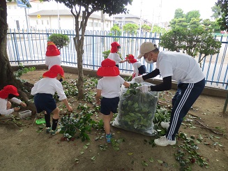 片づけていると、園児がわぁ葉っぱのシャワーだ。葉っぱのトンネルだ。回りに集まって手にとって、喜んでいました。ワイワイはしゃぐ様子に、今日も元気さいっぱいを感じています。上西幼園児は元気です。 その中に、お手伝いをしてくれる園児がいました。手伝いも大好きな園児たち。