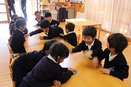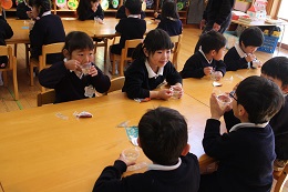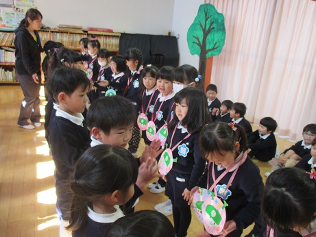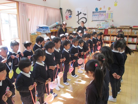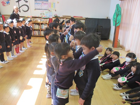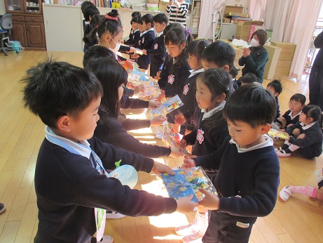 3月16日(木)、いよいよ明日が修了証書授与式です。卒園を明日に控えた今日、しか組さんとりす組さんの「お別れの会」を開きました。お互いに手作りしたプレゼントを渡しあい、エールを贈りあいました。その後、しか組さんとりす組さんが交流して、ゼリーをいただきました。話も弾んで、楽しそうでした。