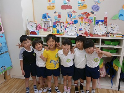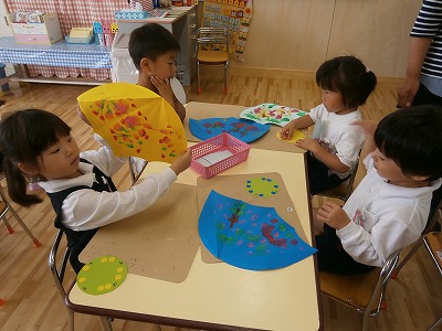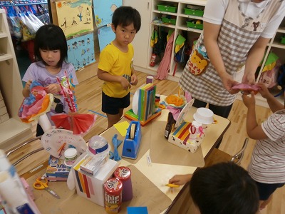 さくら組は、箱を張り合わせ、自分のイメージに合わせて、時計を完成させました。面白い作品ができ、子どもたち同士で、「いいのができたね」と喜びあっていました。