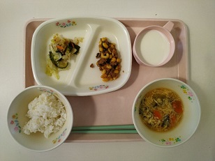 ソイ丼 かきたま汁 バリバリサラダ 牛乳