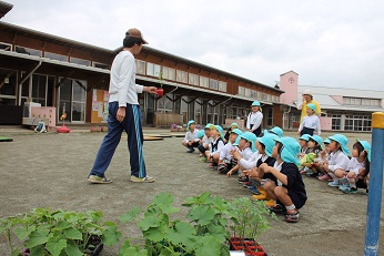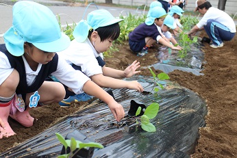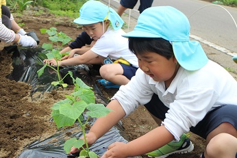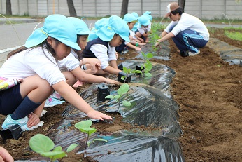 5月8日(火)、あいにくの雨予報でしたがなんとか雨雲の切れ間をぬって、野菜の苗を植えました。きゅうり、なす、ピーマン、ミニトマト、小玉スイカの野菜と今年は大冒険のズッキーニを植えました。5歳児の園児たちが、畑に入って、「大きく育ってね」と声をかけながら、植えてくれました。明日から、水やりが始まります。年中さんや年少さんも水やりを手伝います。毎日毎日、一生懸命大きくなって、花をつけ、実をつけていく様子を観察することで、たくさんのことを学んでほしいと考えています。