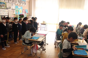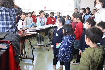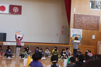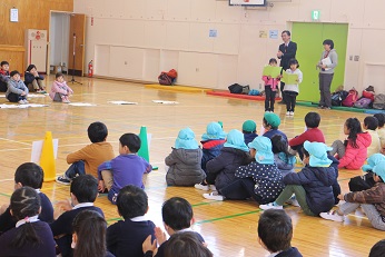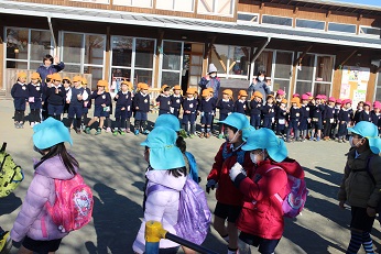 2月12日(火)は5歳児が本郷小学校へ園外保育に出かけました。近隣の保育園なども集まり、本郷小学校の1年生と交流をします。5歳児は、時折、冷たい風の吹く中を1時間5分かけて、歩いて本郷小学校へいきました。4月からは通学班で歩いて登校する子供たちです。弱音もはかず、通過する新幹線に歓声をあげながら、ひたすら小学校を目指して、歩きました。体育館では、1年生が司会をする中、校長先生の歓迎のことばや1年生による小学校生活の紹介、暗唱やなわとびの様子を見せてもらいました。いっしょに歌ったり、じゃんけん列車を楽しみました。1年生に手を引かれての校内見学、昨年まではいっしょに遊んだお兄さんやお姉さんが頼もしく見えたようです。