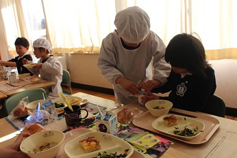 幼稚園生にとっては初めての授業風景も見学させていただきました。算数の授業や音楽の授業などを見学しました。給食体験では、1年生に牛乳パックの開け方や片づけ方などをやさしく教えてもらい、幼稚園では一番大きなお兄さんやお姉さんも小学生にお世話になりました。