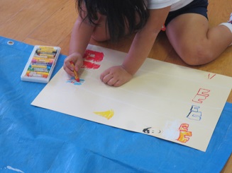 先生・友だちに聞いたり、万国旗の本を見直したり、鳴子や法被を見直したりしてる子、臆せず描くことが好きで、少しずつでも知らないうちに表現を身に付けている感じがしました。