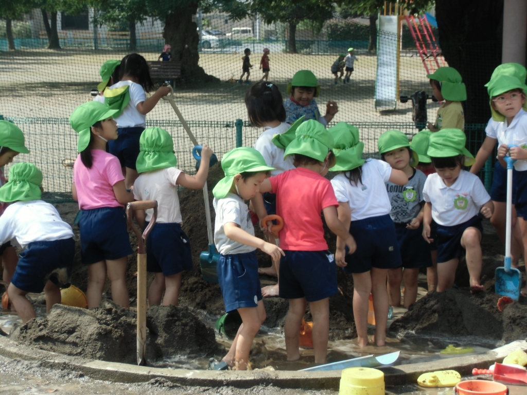 今日も暑くなり、みんなで砂場で水遊び。