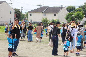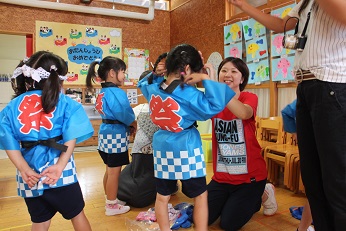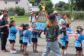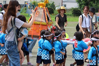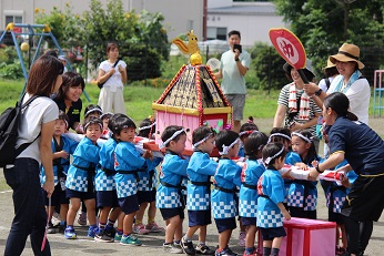 7月13日(金)は朝から良く晴れ渡りました。9時から、第1部「おみこしわっしょい」を行いました。井上PTA会長、園長の話の後、パイナポー体操を行いました。やる気に満ちた、元気な体操を見せてくれました。続いて、お神輿わっしょいです。3歳児、4歳児、5歳児、上手に、元気な掛け声とともに園庭を一周しました。家族に見守られて、励まされて、園児たちも笑顔で大張り切りです。最後は、ご家族の方と「お菓子な音頭」をいっしょに踊りました。