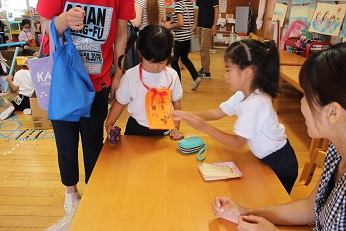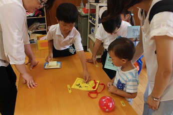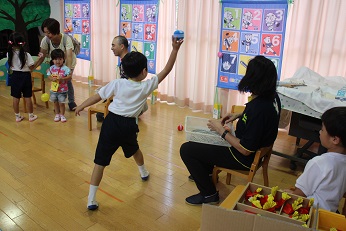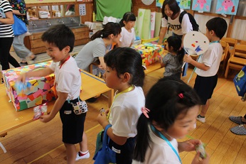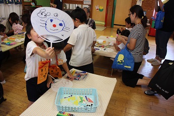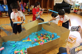 第2部は園舎の中で、5つのゲームを家族の方と楽しみました。ボール投げ、魚釣り、ヨーヨー釣り、うちわづくり、お楽しみ箱、5歳児が受付をし、お当番の園児の保護者の方にお手伝いいただいて、行いました。昨年度から、年長児が準備や進行を行います。きっと楽しんでいただけたはず、5歳児さんはがんばりました。その後、懇談会を行いました。ご協力ありがとうございました。