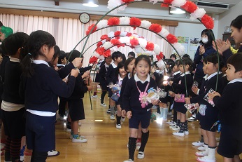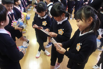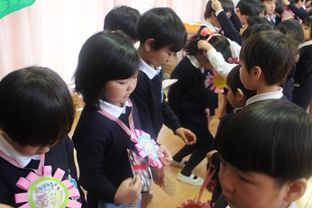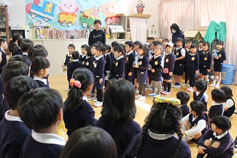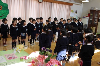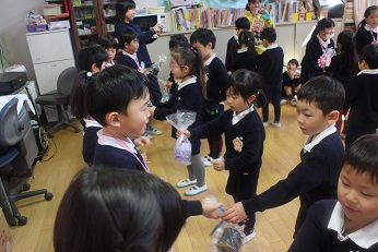 3月15日(金)は、きりん組さんとのお別れ会を行いました。修了証書授与式まであと少しとなりました。今日まで、りす組さんやしか組さんは、お世話になったきりん組さんへ「ありがとう」のプレゼントを制作し、きりん組さんは「がんばってね」の気持ちをこめて、キーホルダーを作りました。3歳児クラスは紙のメダルを、4歳児クラスはきりん組さん一人一人のランドセルの色を聞いて、同じ色のランドセルを牛乳パックで制作しました。5歳児クラスは、プラ版にかわいい絵を描いてキーホルダーを作りました。お歌のプレゼント交換をしたり、言葉を交わしたりしました。3歳児と4歳児が準備したアーチの中を5歳児は通ってお部屋に戻りました。いよいよ、卒園です。