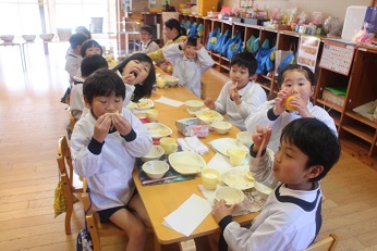 お別れ会の後、きりん組さんは幼稚園で食べる最後の給食を仲良くいただきました。